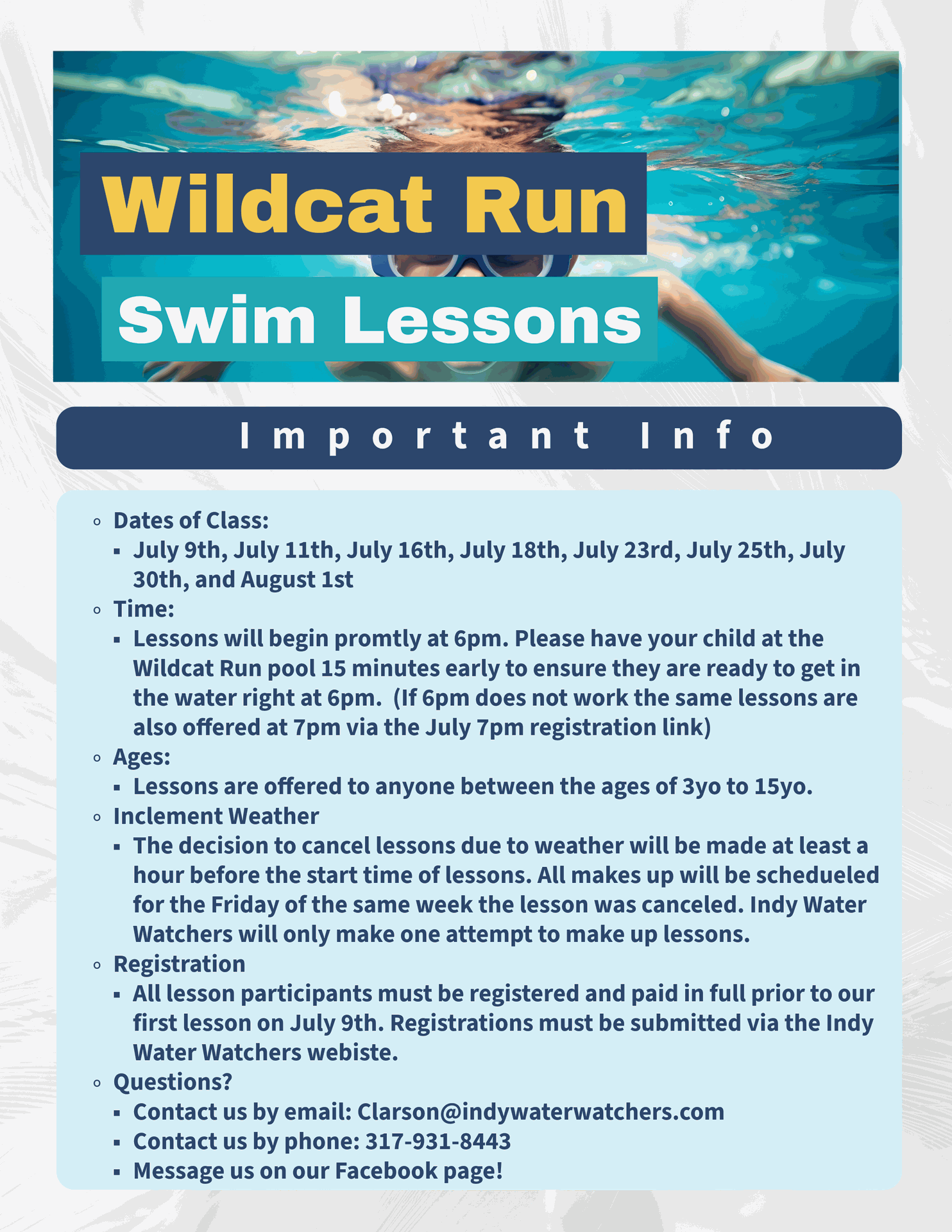 Indy Water Watchers is excited to host swim lessons at Wildcat Run for the 2024 pool season. Please see details below and reach out with any questions!