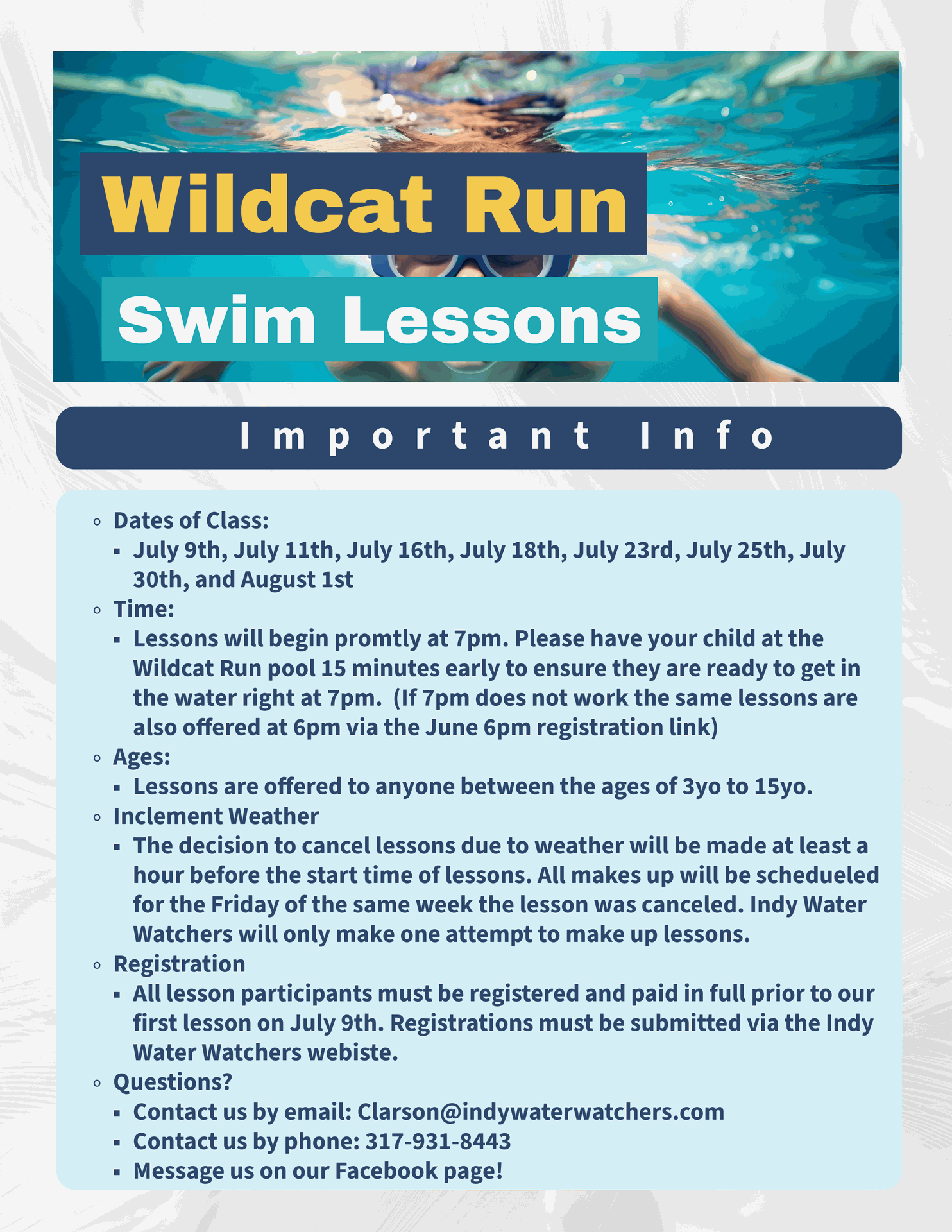 Indy Water Watchers is excited to host swim lessons at Wildcat Run for the 2024 pool season. Please see details below and reach out with any questions!